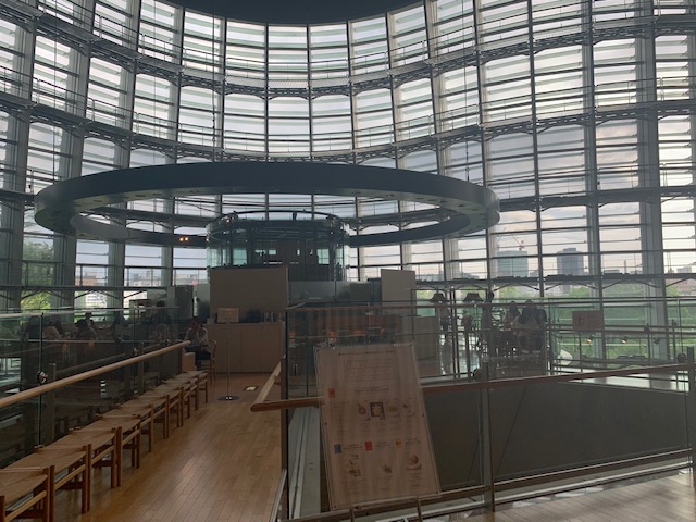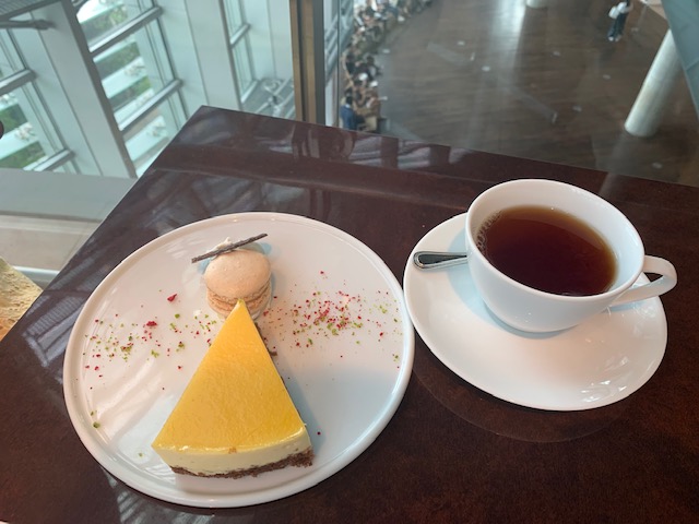 巨大な逆円すいの最上部に広がる空間で、席によっては空中に浮かんだティーサロンのようです